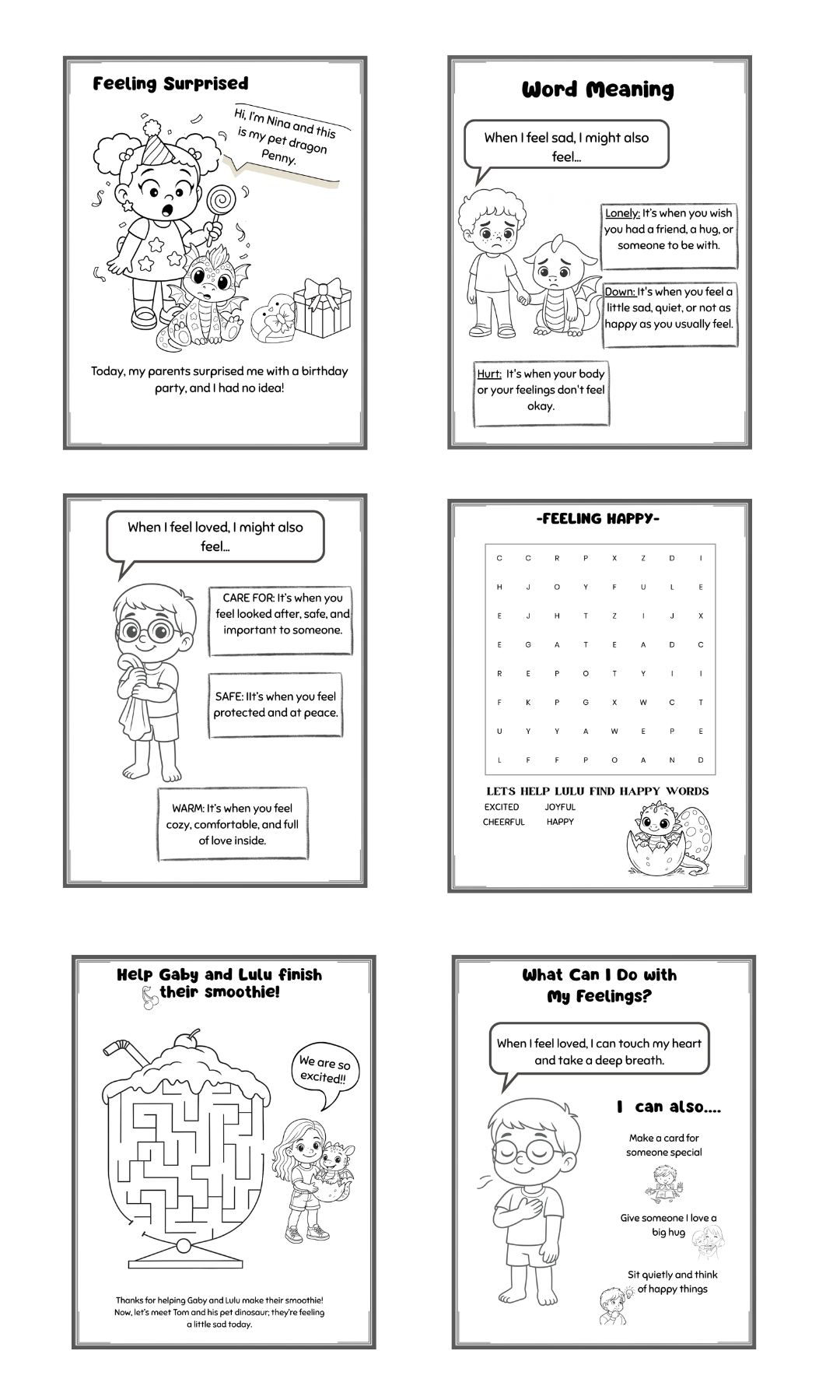 The book includes coloring pages, drawing prompts, and creative exercises that help children express emotions, develop fine motor skills, and enjoy screen-free fun